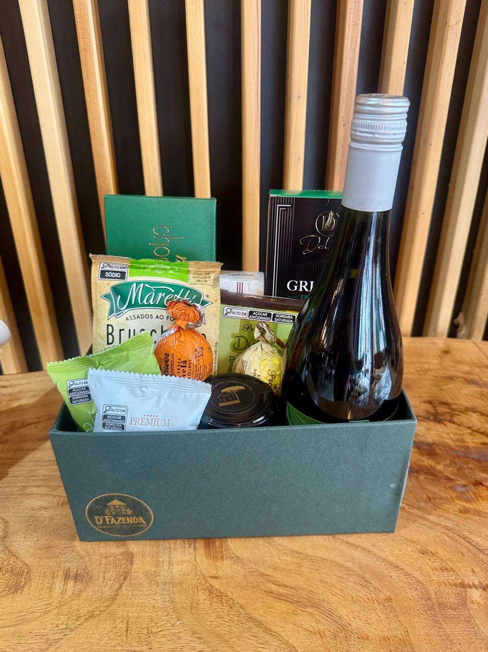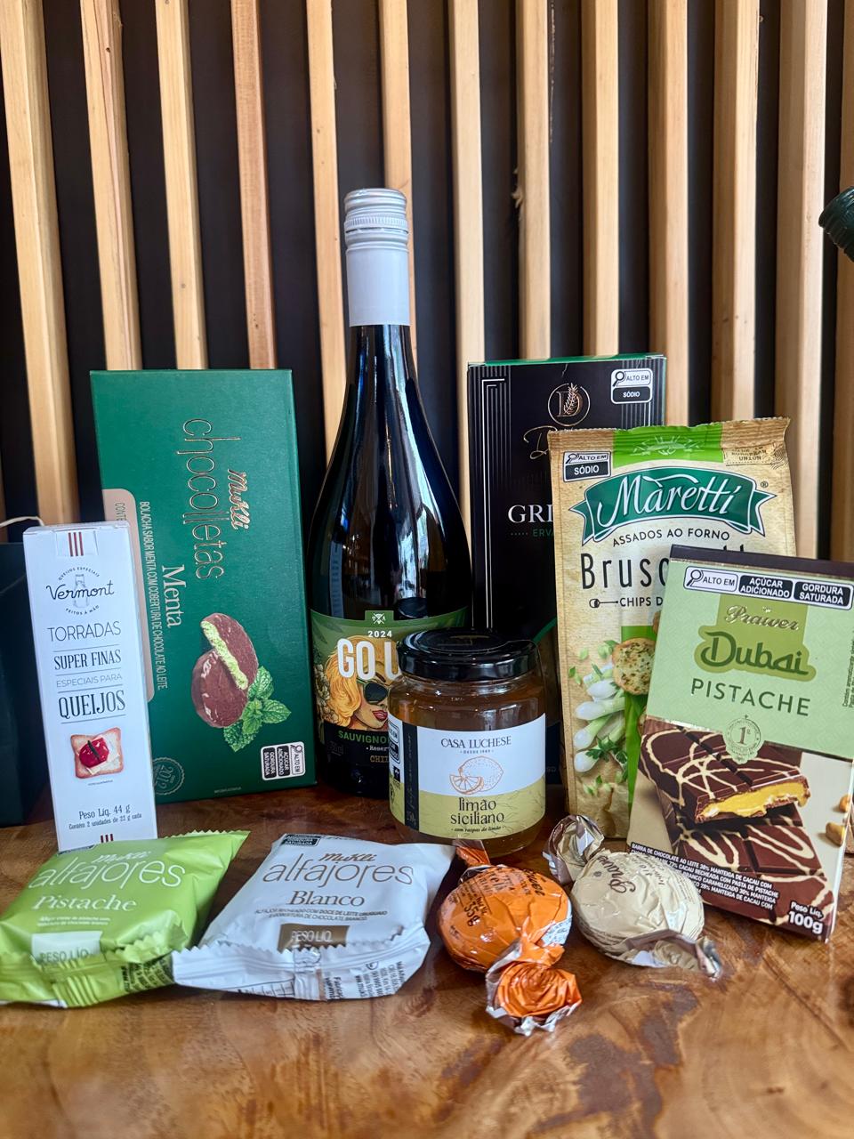 Uma cesta sofisticada e completa, apresentada em caixa acartonada verde, ideal para presentear com elegância e personalidade. A seleção combina vinho estruturado, antepastos delicados, chocolates finos e produtos gourmet cuidadosamente escolhidos.