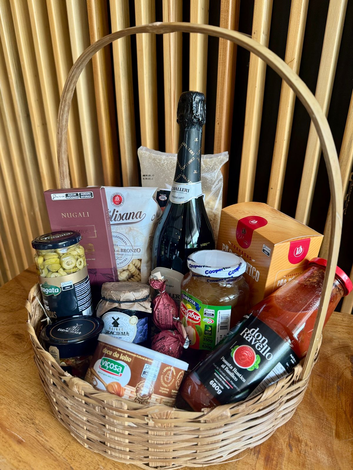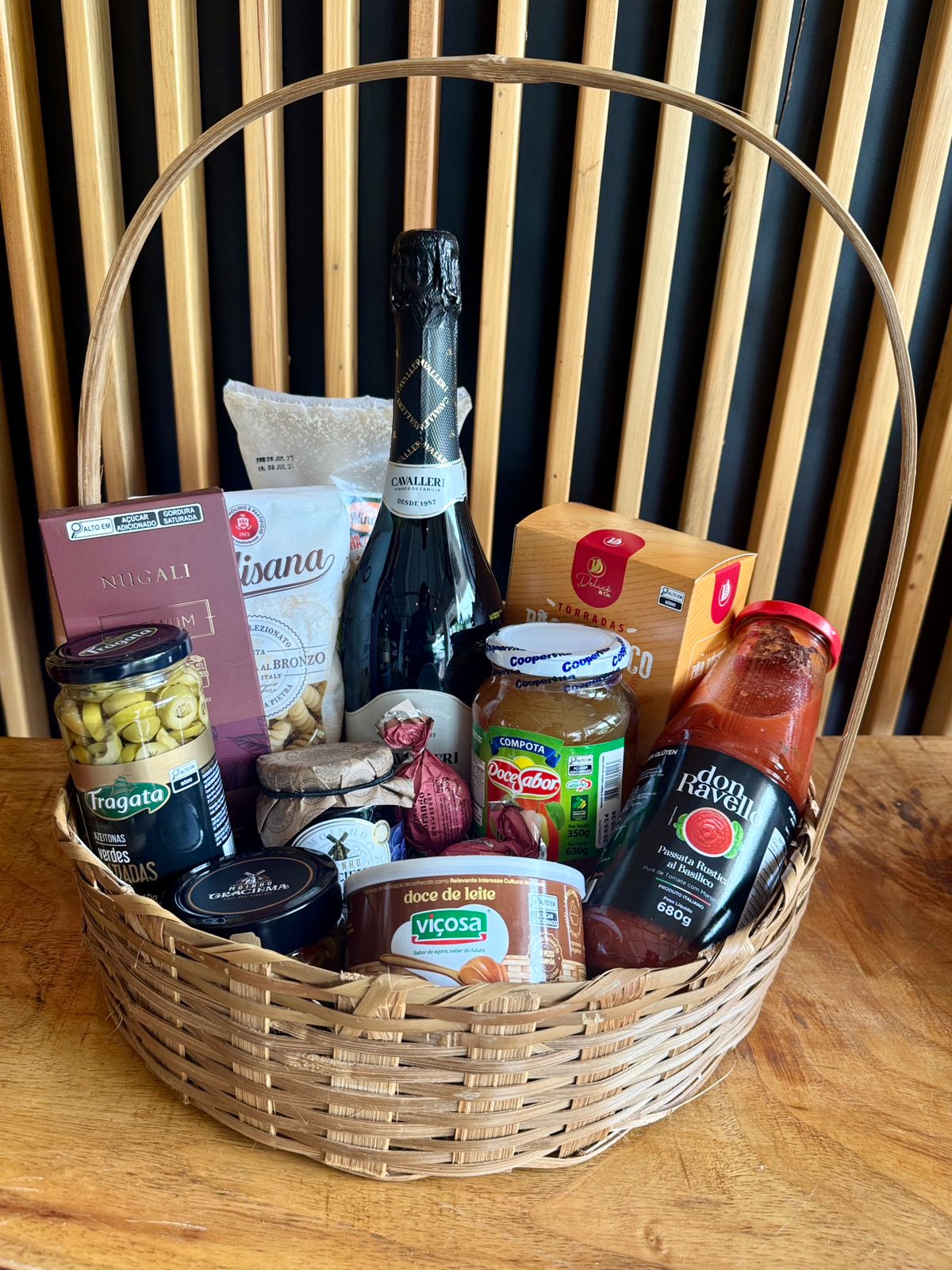 Esta cesta contém uma seleção especial com cerveja pilsen, doce de cacau, pão de mel, grissini sabor provolone, creme de parmesão, alfajores variados, trufas recheadas e molho sweet chilli hortelã, acomodados em uma bandeja MDF retangular para presente. Uma opção completa para quem gosta de combinar sabores doces e salgados com uma boa cerveja. ?✨