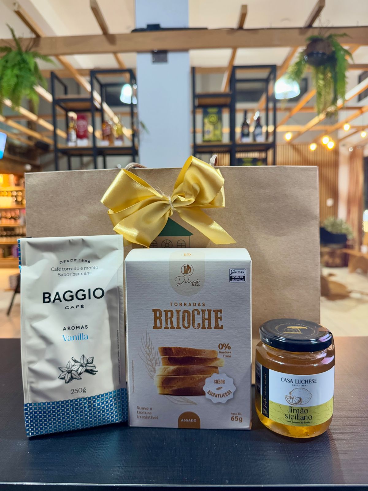 Um kit de café da manhã/gentileza pensado para conquistar desde o primeiro olhar. Este Kit combina sabores suaves e texturas crocantes para um momento acolhedor: geleia de limão siciliano (250 g) Casa Lucchese, café Baggio aromas (vanilla) 250 g e torradas pão brioche Delice 65 g. Todos os itens são embalados com cuidado e entregues em nossa sacola personalizada da loja, finalizados com um laço — prontos para presentear.