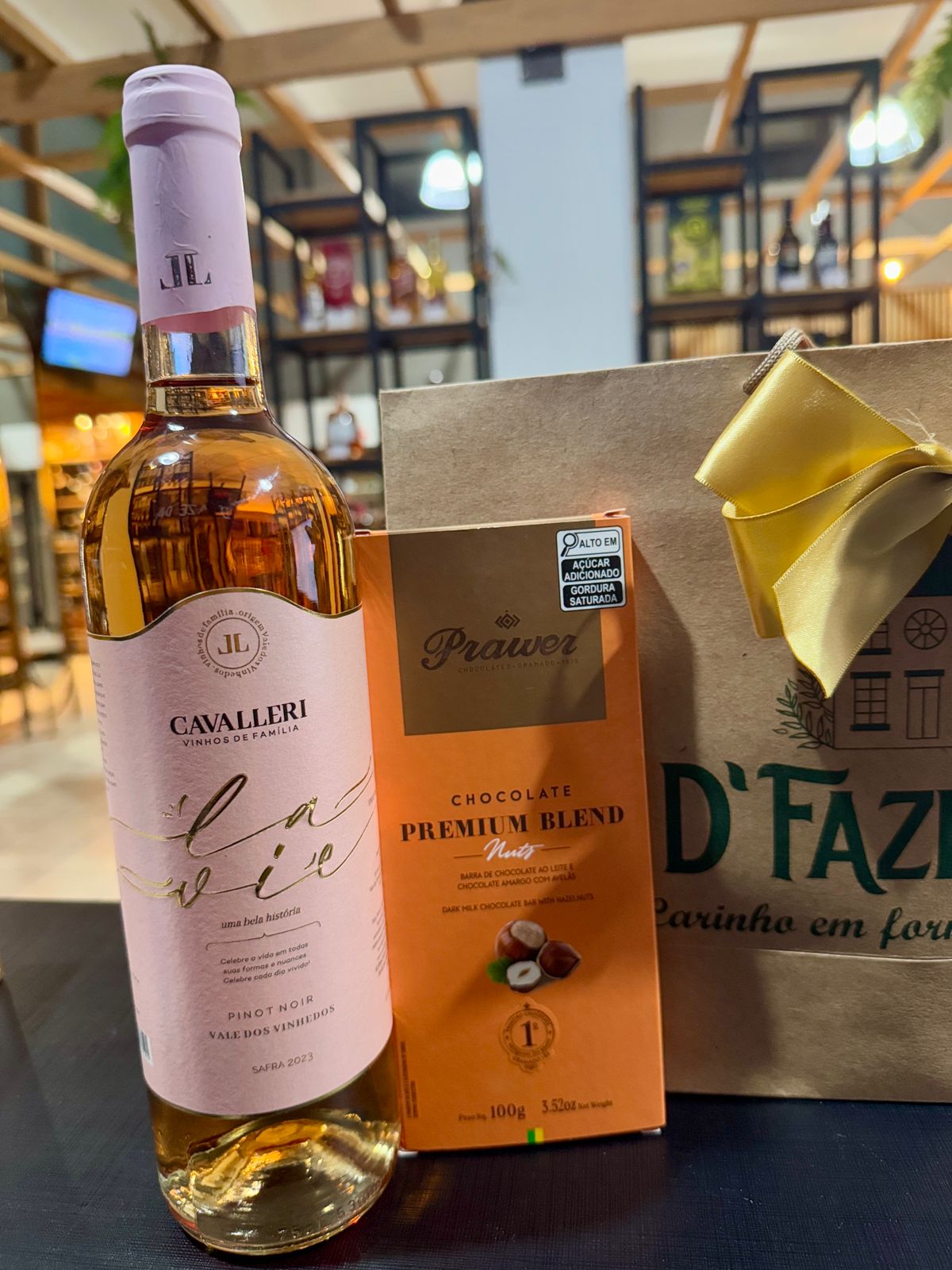 Um kit elegante e sofisticado, perfeito para presentear em datas especiais como o Dia da Mulher ou em celebrações íntimas. O Kit reúne um rosé de qualidade e um chocolate premium para combinar harmonia entre bebida e sobremesa. A composição traz um vinho rosé Pinot Noir Lavie Cavalleri e uma barra de chocolate premium Blend (100 g), embalados com cuidado e entregues em nossa sacola personalizada da loja, finalizados com um laço — prontos para presentear.