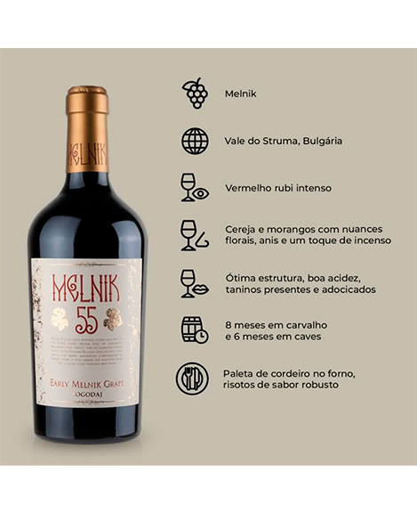 O Vinho Tinto Seco Melnik 55 Logodaj 750ml reúne tradição búlgara e personalidade marcante em um rótulo sofisticado. Produzido com a uva Melnik, variedade autóctone da região de Struma Valley, entrega cor rubi intensa, aromas complexos e paladar estruturado. Um vinho expressivo, equilibrado e ideal para apreciadores de tintos encorpados.
